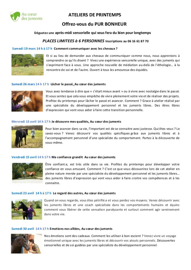 Pour en savoir plus sur les EquIdées (journées ou demi-journées thématiques) et leurs déroulements et/ou pour vous inscrire, contactez-nous au 06 16 61 87 70 ou par mail aucoeurdesjuments@gmail.com